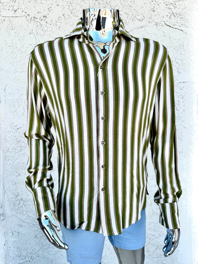 It’s a soft, drapey, 97% cotton/3% spandex poplin with very personable stripes. Our pearl gray buttons are particularly nice here.