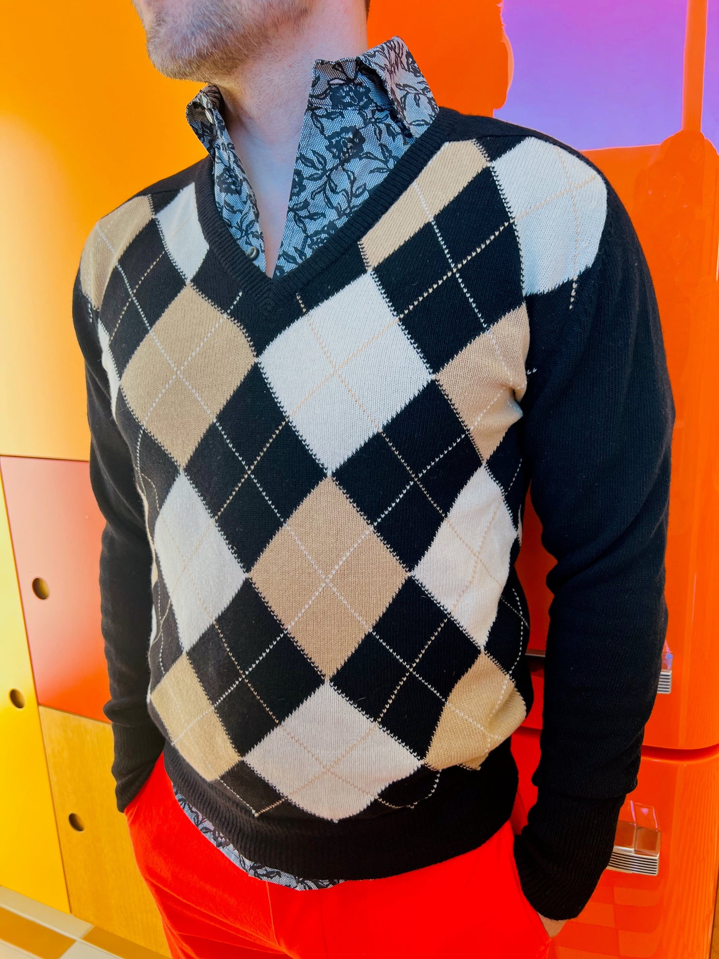 One-off vintage cashmere sweater, handwoven Intarsia by Hawico of Scotland.