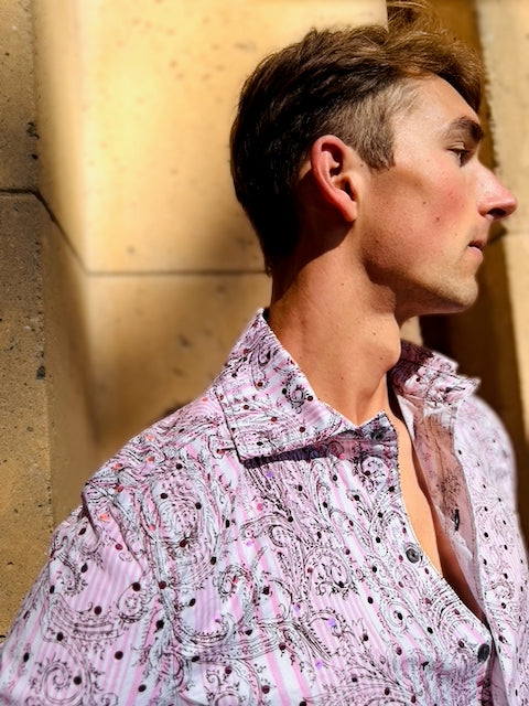 Lovely stretch cotton poplin with flashy lightweight sequin-like stickers.