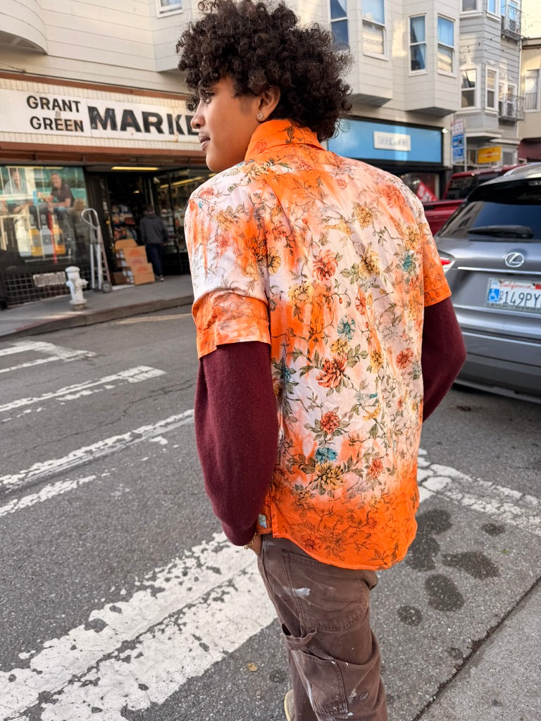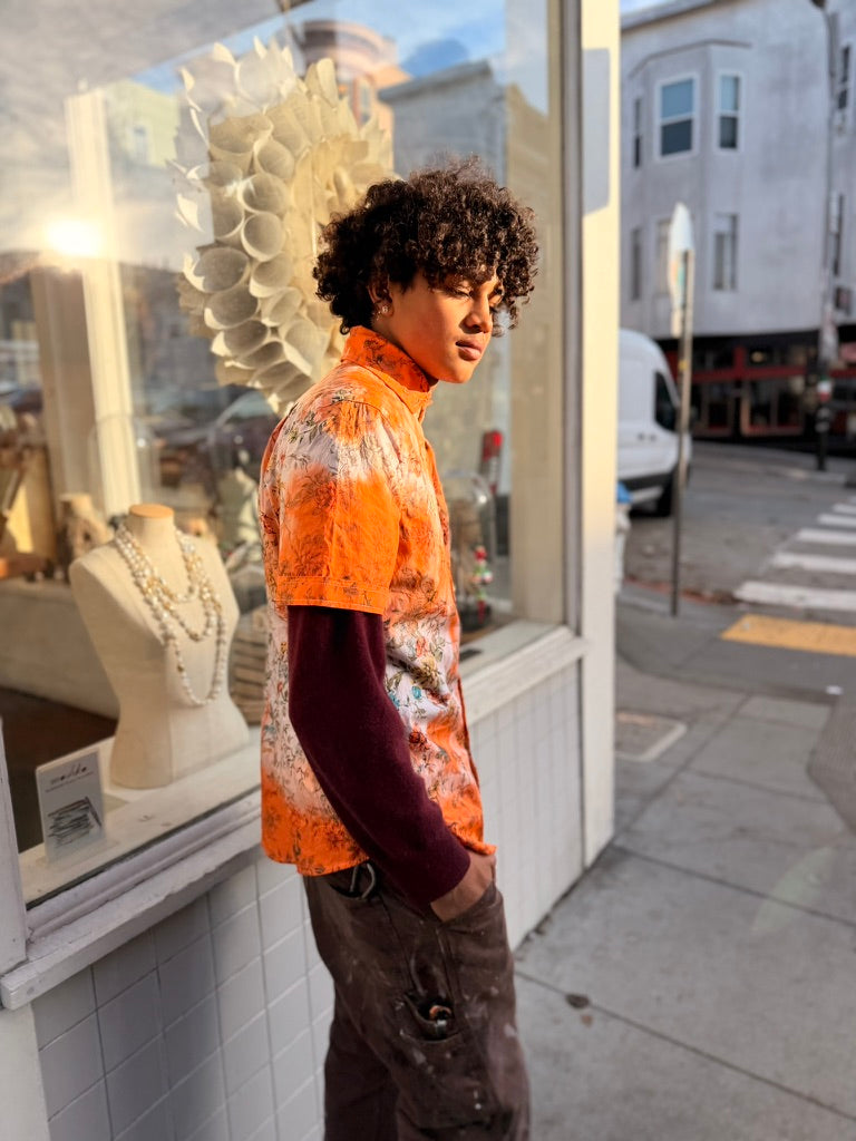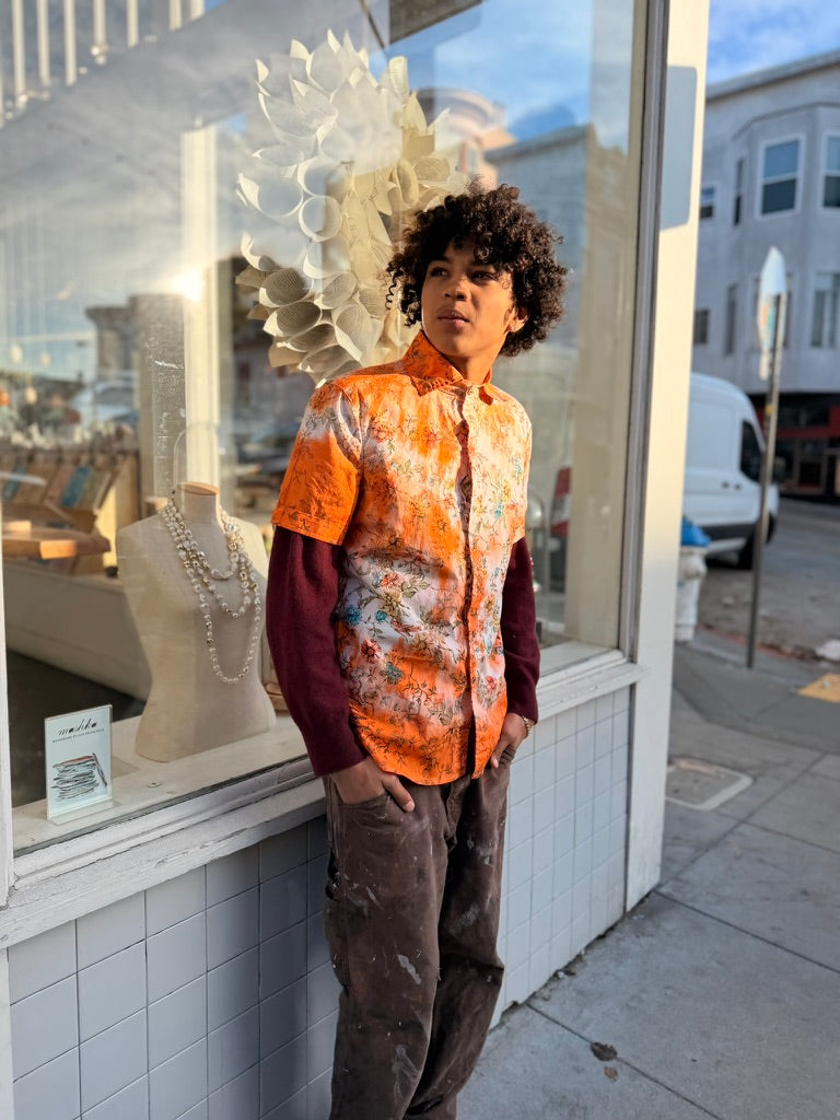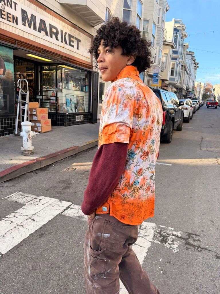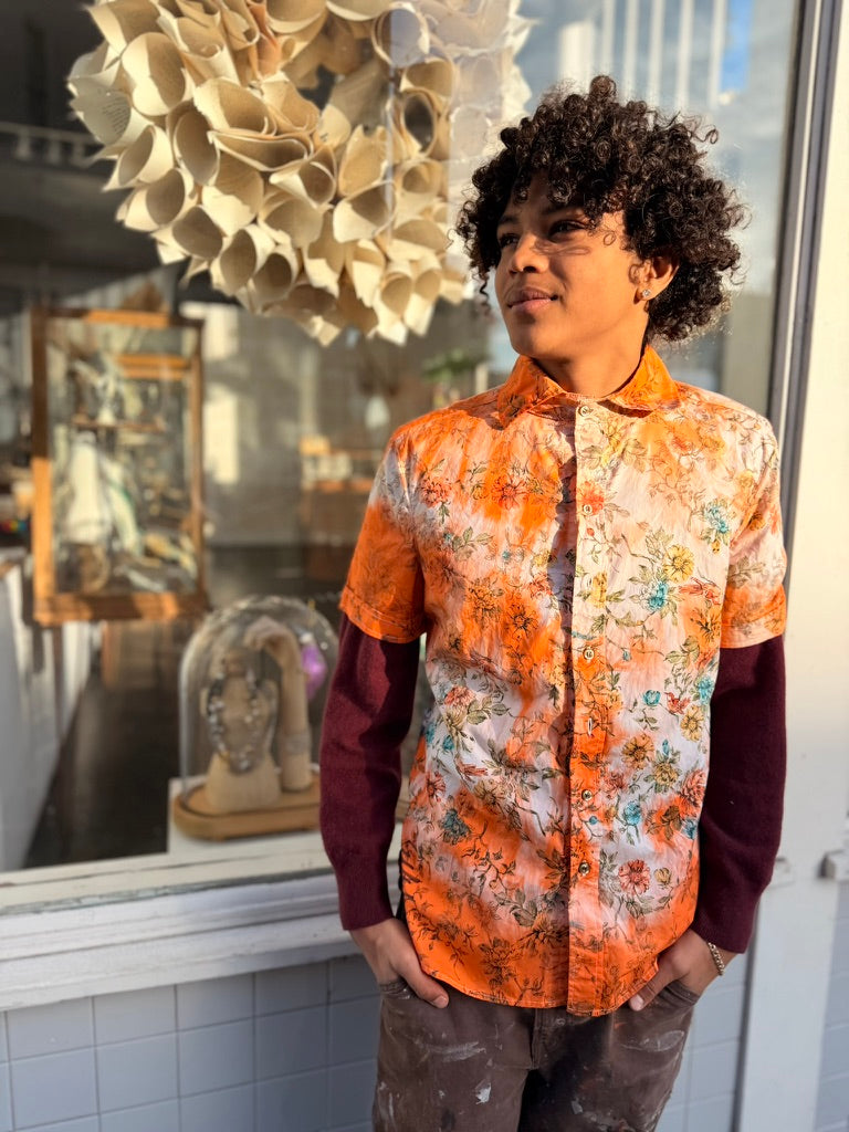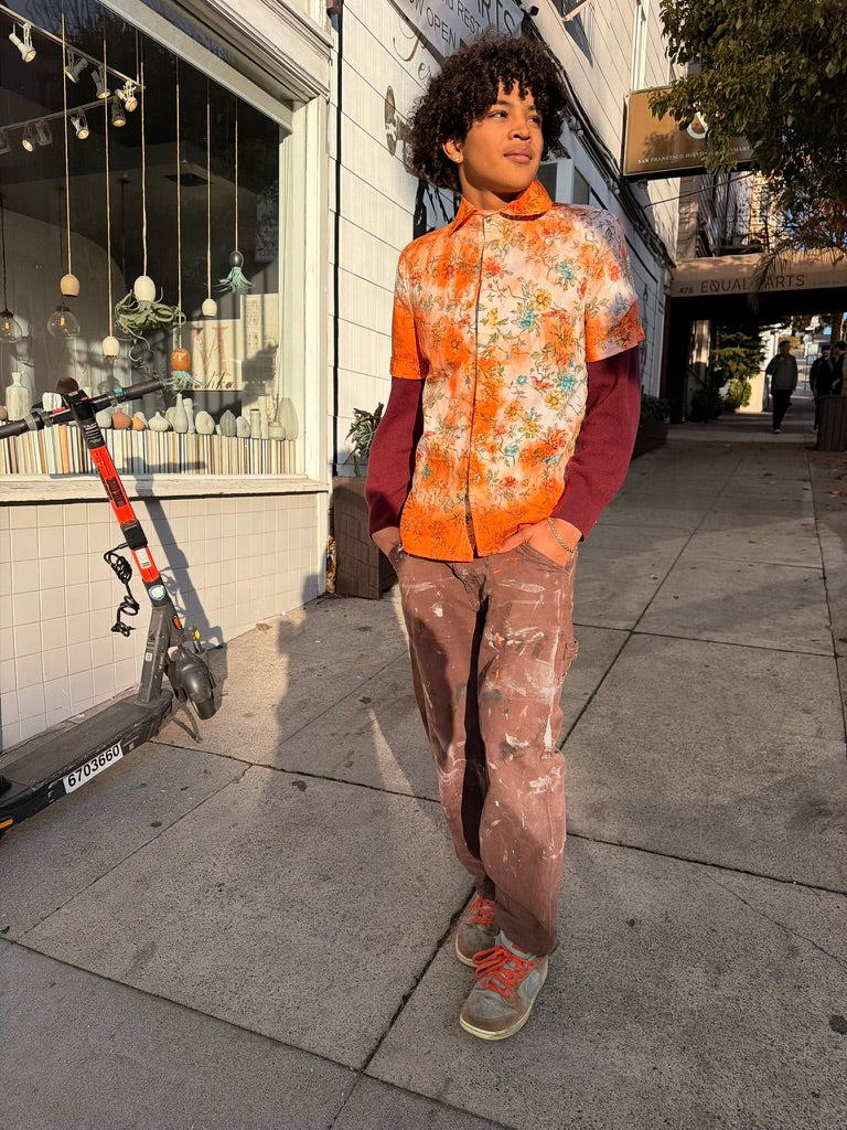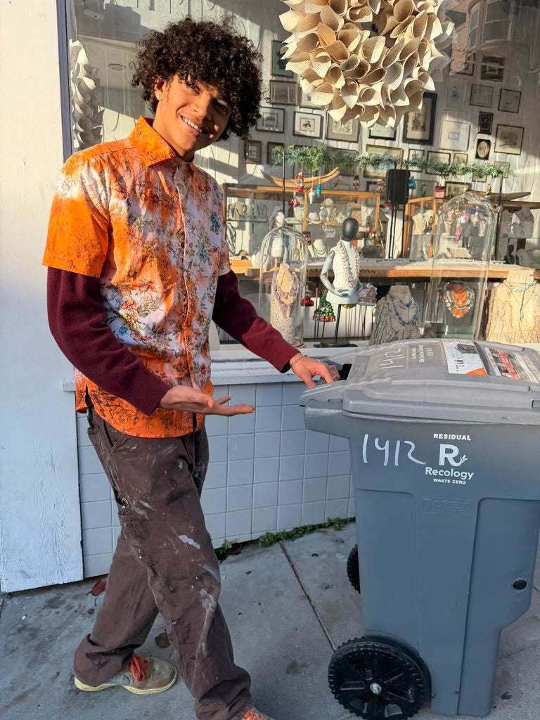 Left to bleed in the washer barrel, then bleached to near nothing, Schuyler, our founder, re-dyed 63 pieces, by hand, with the assistance of his friend Lucy, on his back patio in San Francisco.