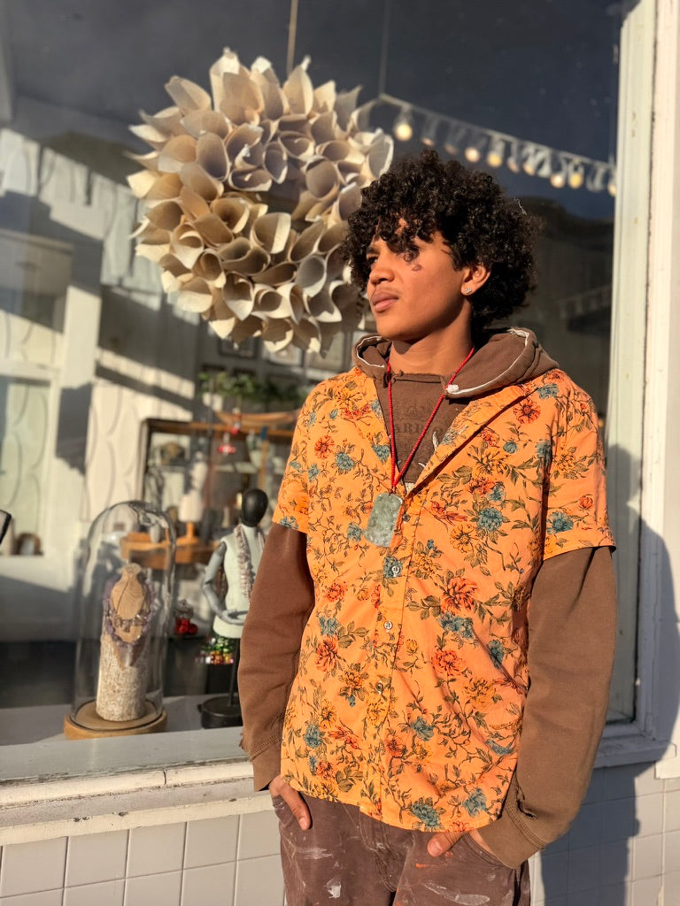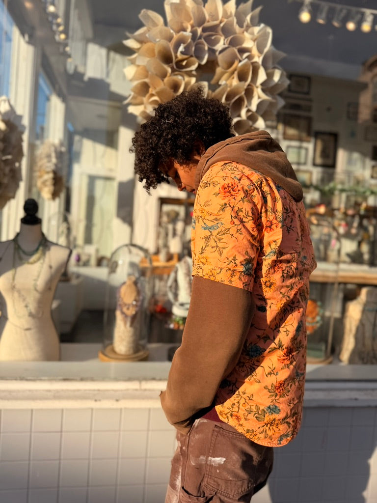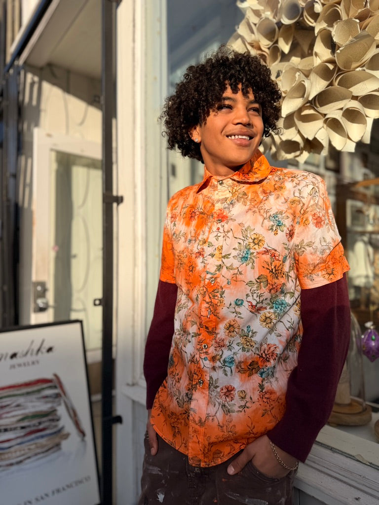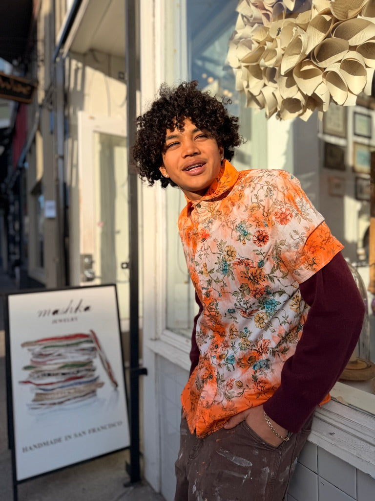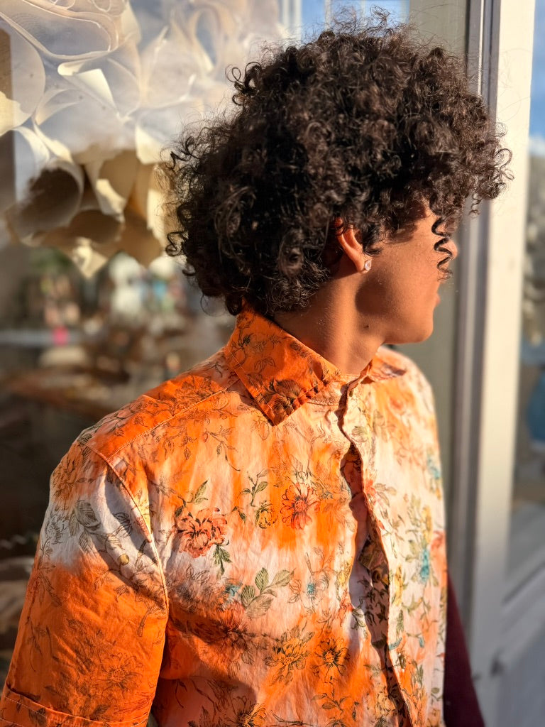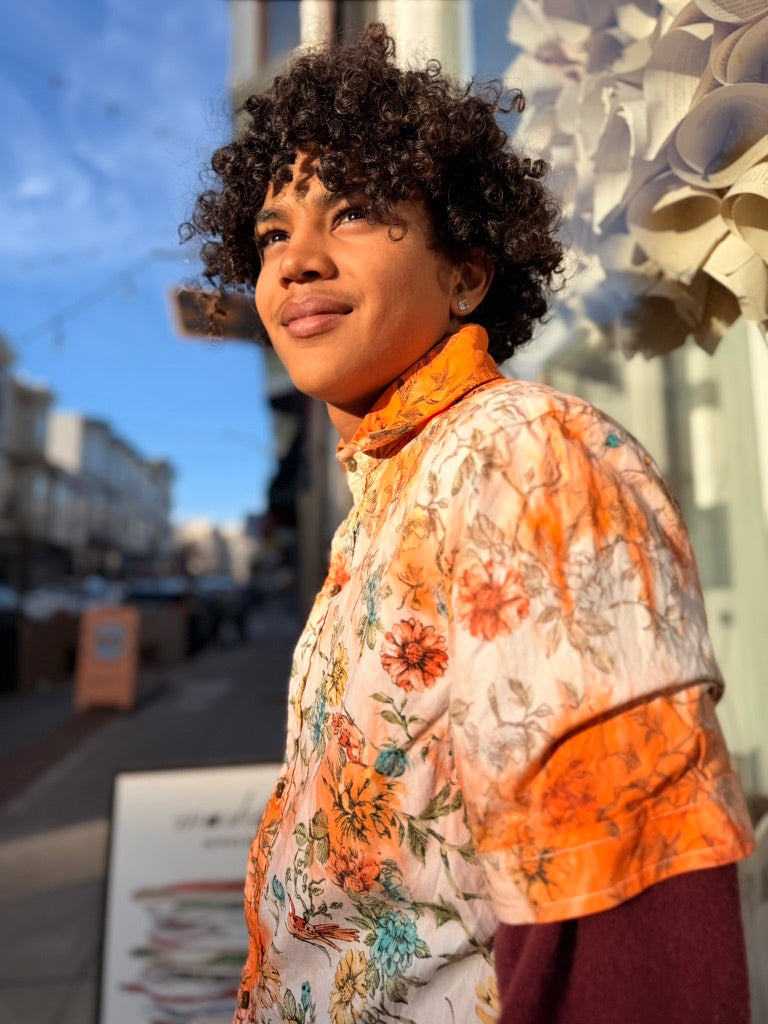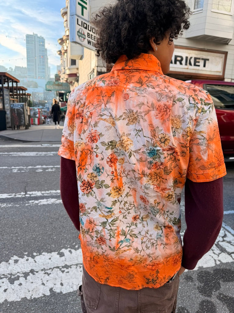 Left to bleed in the washer barrel, then bleached to near nothing, Schuyler, our founder, re-dyed 63 pieces, by hand, with the assistance of his friend Lucy, on his back patio in San Francisco.