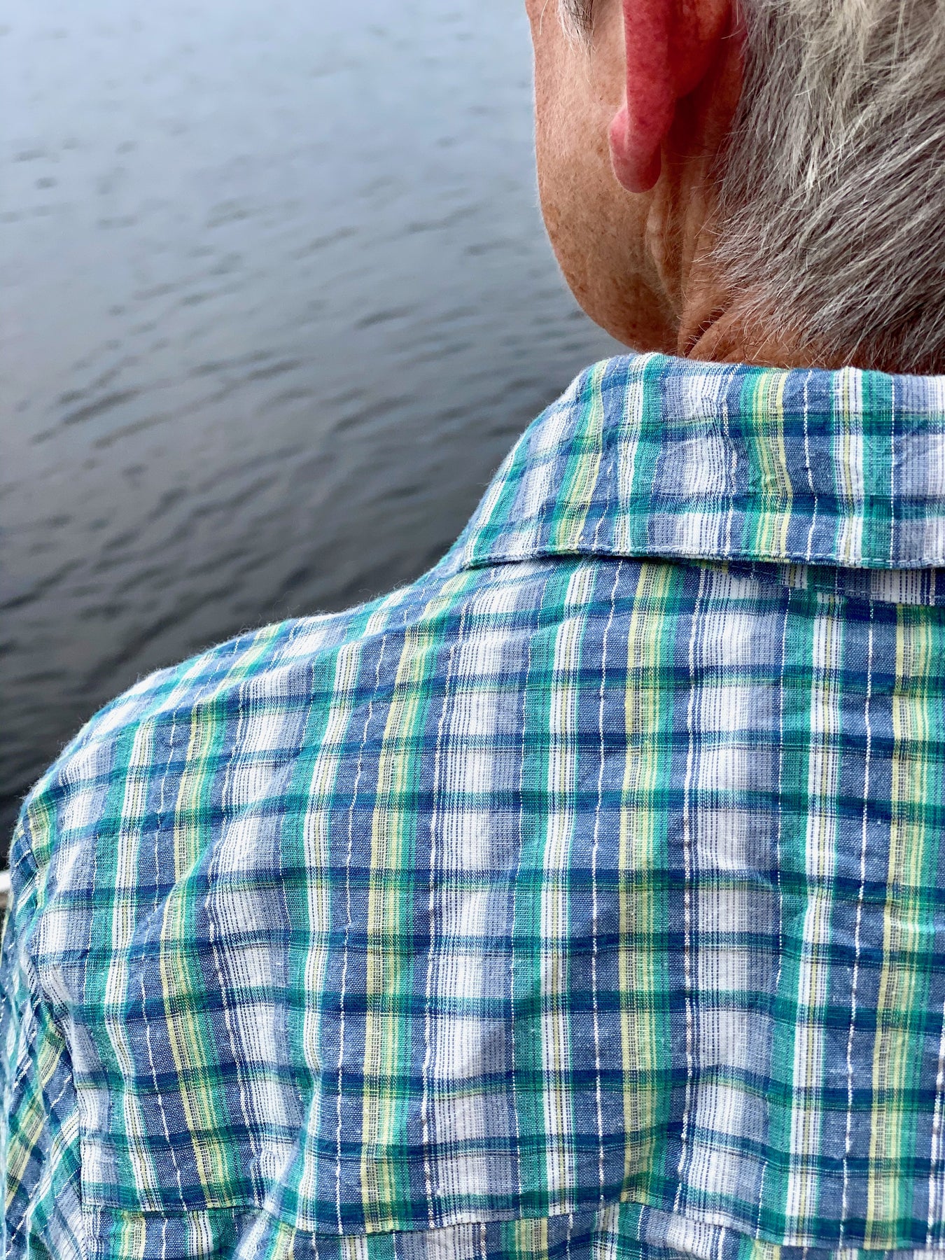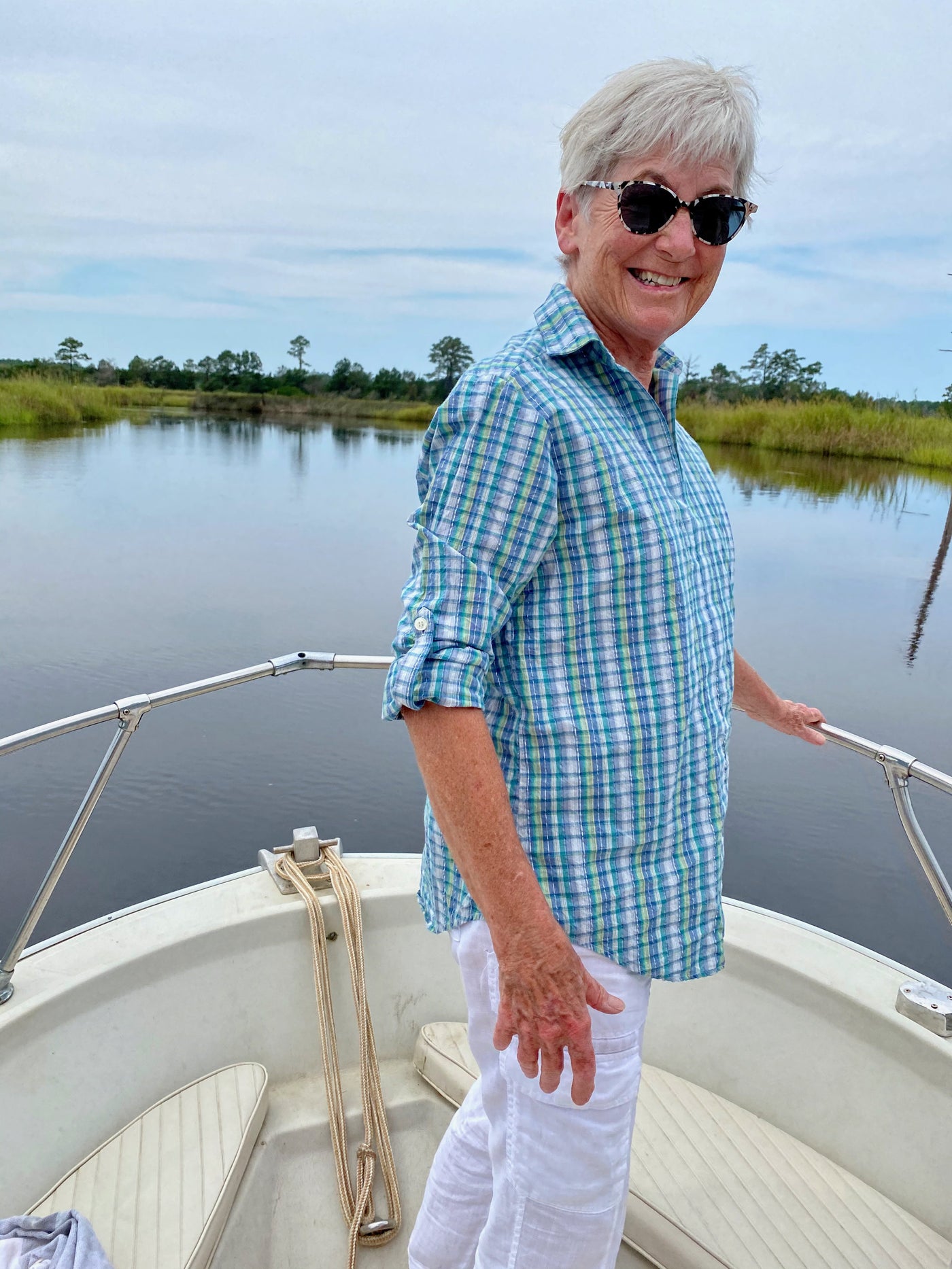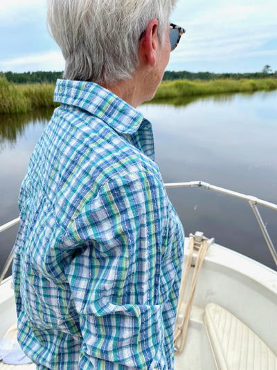 Gateway Blue is a summer plaid Seaplane-style in navy, teal, butter — and shiny silver Lurex — stripes.